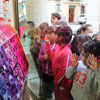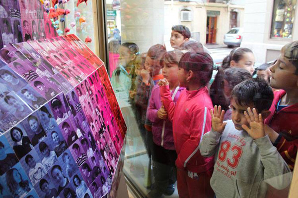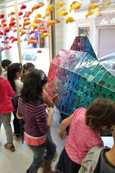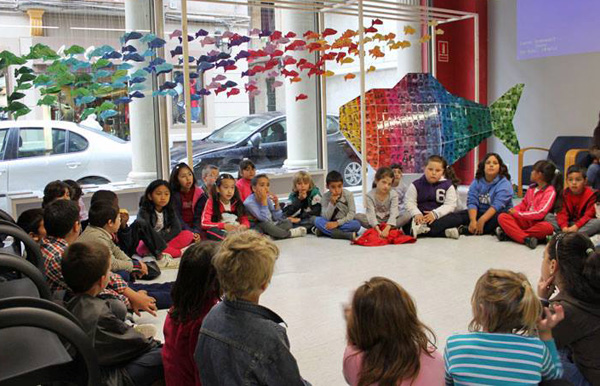 Window display in the Barceloneta-La Fraternitat public library (Barcelona) for the 'Llegir x Llegir' program, a reading activity with children from neighborhood schools (2013).